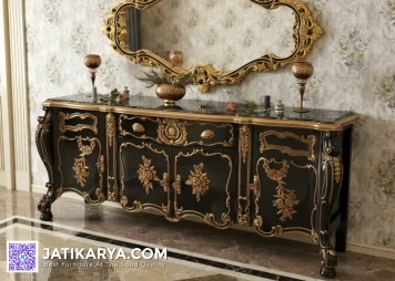 Mencari Bufet Klasik Mewah Jakarta Luxury yang berkualitas asli dengan ukiran detail dan kayu jati pilihan? Anda berada di tempat yang tepat. Bufet Konsol produksi pengrajin Jepara dikenal bukan hanya karena tampilannya yang mewah, tetapi juga karena konstruksi kokoh dan nilai investasinya yang tinggi.