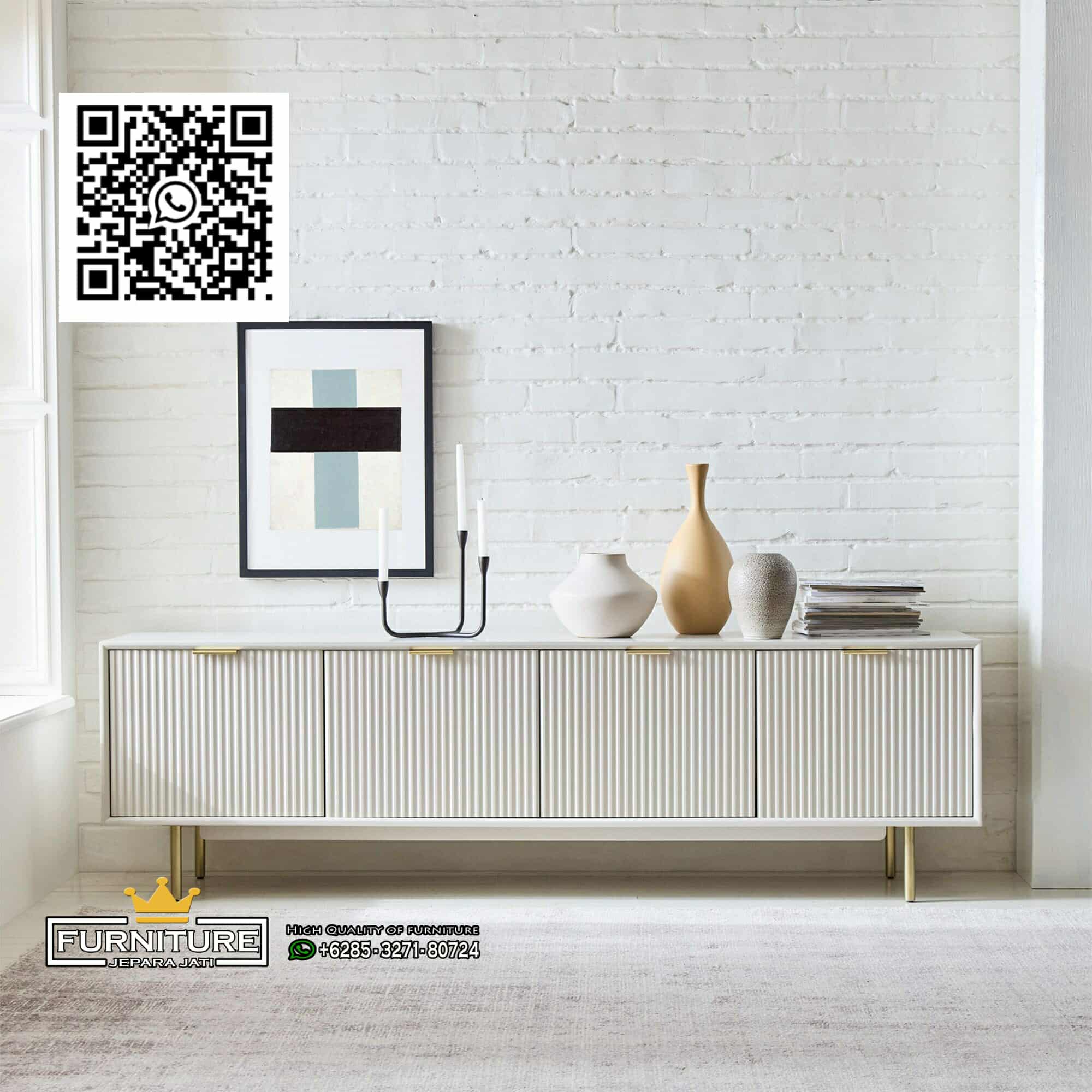 Set bufet tv minimalis mewah ini mempunyai desain yang sangat elegan dengan empat pintu bermotif salur. Kemewahan tidak hanya terlihat pada desain terbaru tetapi juga pada fungsional yang akan anda dapatkan dari bufet mewah ini.