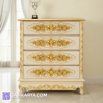 Untuk hotel butik, villa eksklusif, atau apartemen premium, model lemari nakas 4 laci mewah Jepara menjadi pilihan favorit. Kualitas kayu solid memberi kesan kokoh, elegan, dan berkelas—sesuai dengan konsep interior klasik, heritage, hingga resort-style.