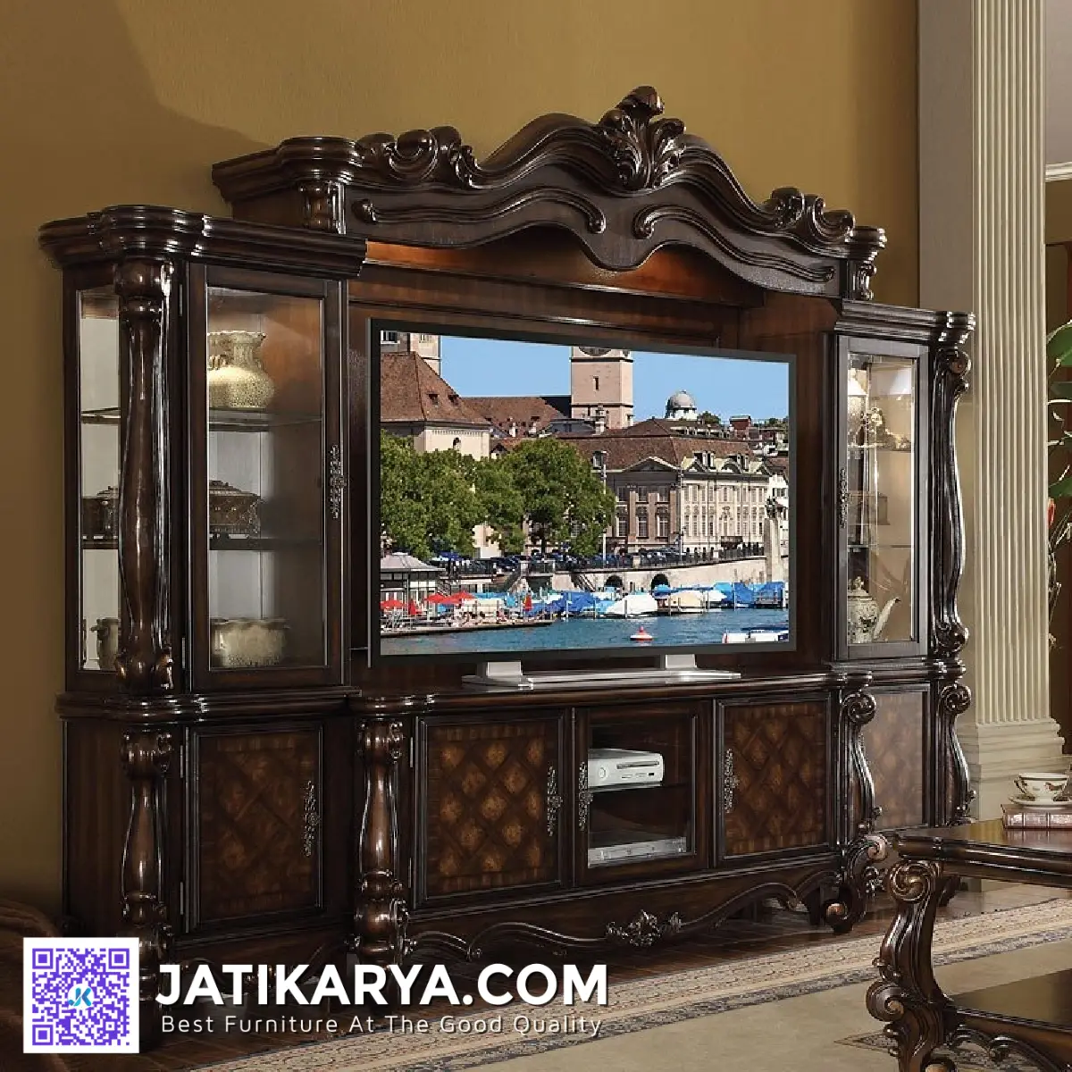 Harga & Cara Pemesanan Lemari Bufet TV Klasik Hias Motif Veneer Versailles Terbaru Jepara :
