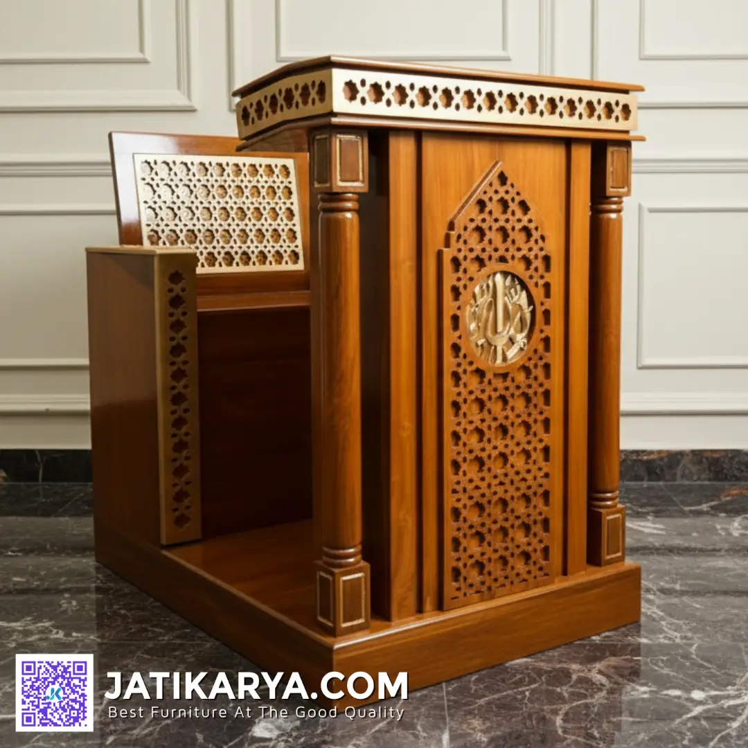 Model Mimbar Kayu Jati Jepara dengan konstruksi yang kokoh dan bahan baku yang berkualitas menjadikan podium masjid ini akan mampu bertahan lama untuk penggunaan jangka panjang.